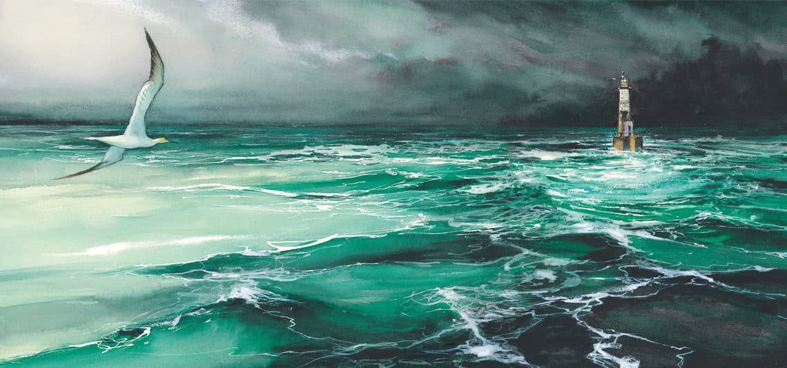 C’est toutes ses expériences qui l’ont mené au livre L’Île Vierge, un phare dans les yeux, publié aux éditions Locus Solus. En 2017, sa bande dessinée Ar-men, l’enfer des enfers s’attaquait au mythique phare surnommé ainsi, le plus éloigné des côtes françaises. Raison pour laquelle il a d’ailleurs été contacté par la communauté de commune du Pays des Abers. Le dessinateur BD nommé en 2021 Peintre officiel de la Marine, une première pour l’institution, poursuit son chemin au milieu des titans des mers et rend cette fois hommage à l’édification d’un autre « cierge de pierre ». Il quitte pour ce faire le large de l’île de Sein à la pointe du Finistère, où repose Ar-men, pour l’archipel de Lilia. Il met en aquarelles la beauté et l’histoire du colossal de pierre de l’île Vierge à travers 21 illustrations originales, enrichies de la plume de l’écrivain Goulc’han Kervella. Ce travail s’inscrit dans le programme de restauration du premier phare, le plus petit, pour en faire un lieu d’accueil.