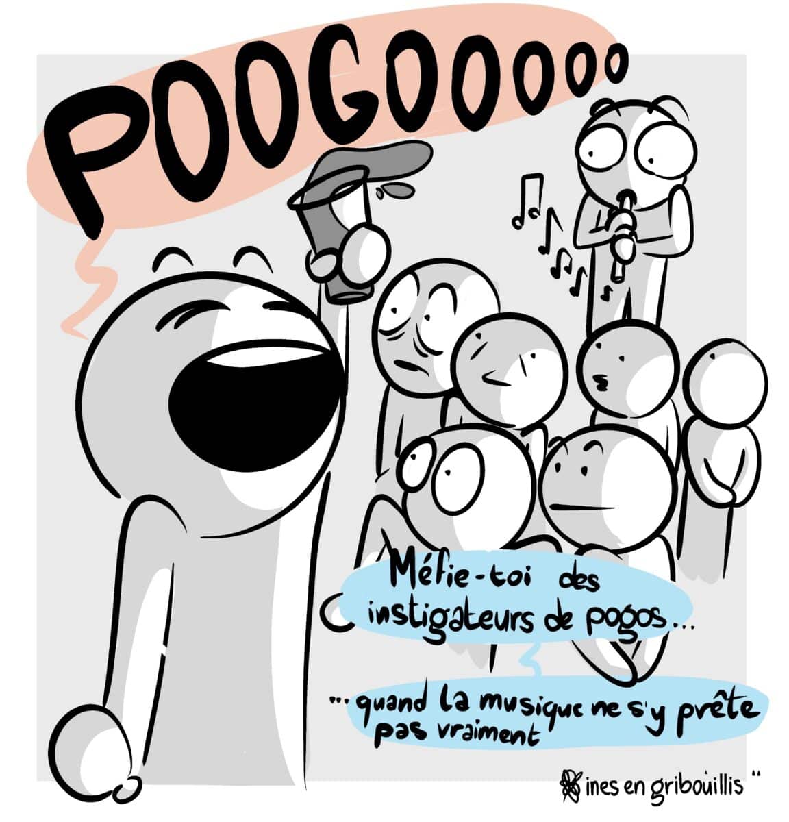 Apparue dans les années 70, le pogo – danse communicative associée au punk rock où les spectateurs se bousculent les uns contre les autres – s’est répandu peu à peu dans les concerts et festivals, jusqu’à devenir une célébration habituelle. À noter que, de temps à autres, les pogos peuvent apparaître au milieu de concerts pour le moins bien divergents de cette danse !