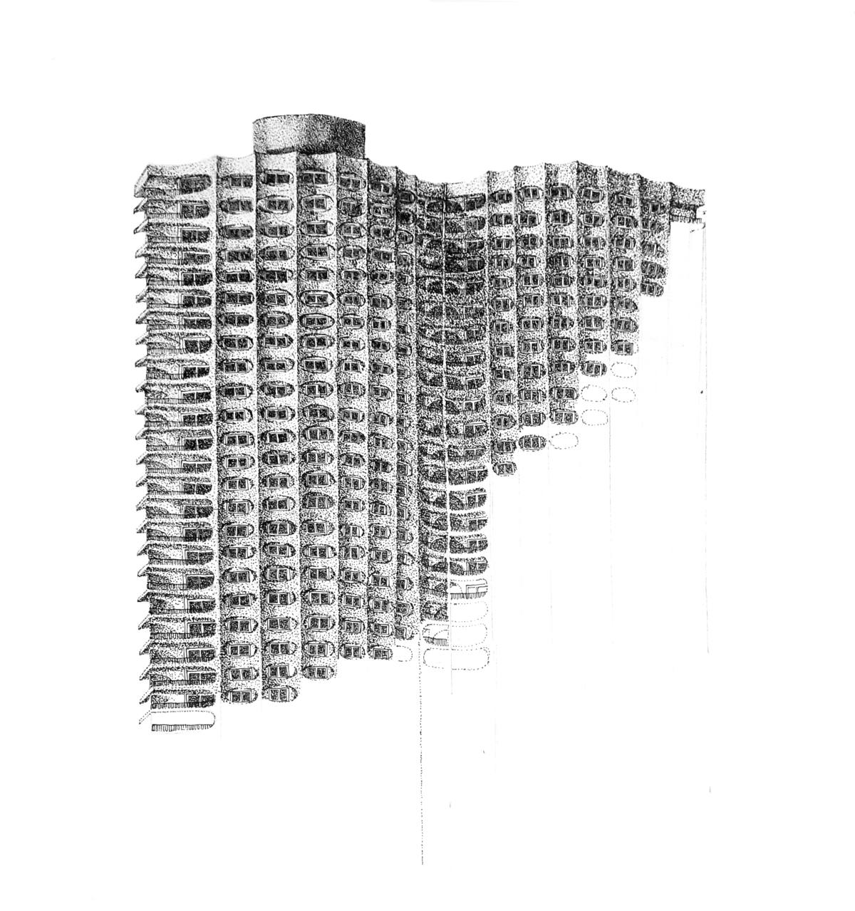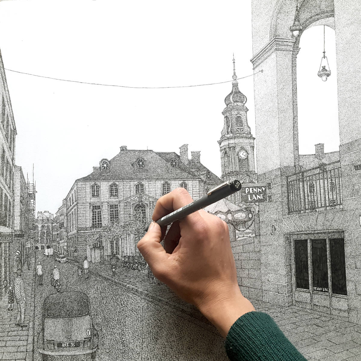 L’architecture de Rennes est très riche. L’historique rencontre le contemporain, comme les bas des Lices et la tour des horizons, j’aime ce contraste d’architecture dans un même espace. Je me promène dans la ville et photographie les lieux que j’aime bien. Je préfère un point de vue qui m’est propre et ainsi propre aux Rennais. Après avoir brièvement fait une esquisse qui matérialise les volumes, je remplis de points. Ça m’arrive de mettre moins de temps, peut-être avec la pratique.