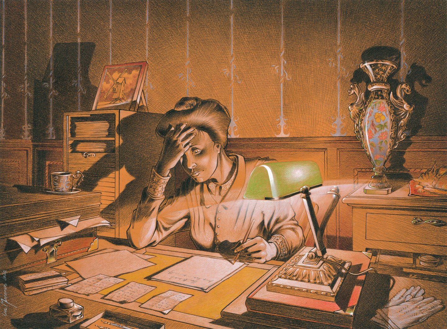 Luc Monnerais joue avec les différentes duretés des crayons gris pour composer des images aux contrastes saisissants. « Ce n’était pas suffisant donc j’ai commencé à utiliser ce fameux crayon noir à partir de ce moment-là. » Cette technique l’a ensuite accompagnée dans sa rencontre avec Hélène Jegado, personnage principal de la BD Arsenic (2017), toujours en collaboration avec Keraval. « La Jégado a vécu au XIXe siècle, je voulais trouver les ambiances qui traduisent cette époque et ce crayon correspondait très bien. »