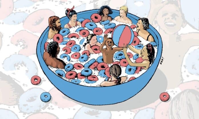 Hugues Renouard a voulu projeter une ambiance qui contraste fortement avec ce que l’on a vécu.Une échappatoire. Des pensées qui ont accompagné nos petits-déjeuners et nos espoirs tournés vers la fin de l’été. Un visuel empreint de l’univers de l’artiste : décalages, pop culture 90’s, réalisme, et une dose d’humour.