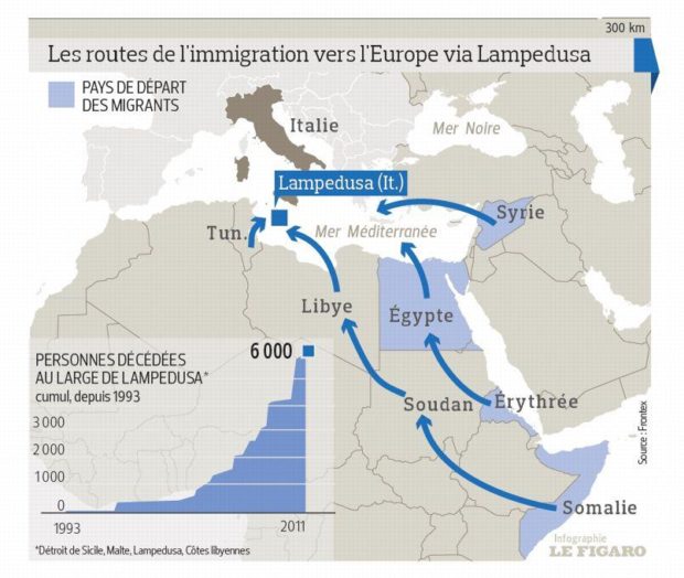 morts qui les ont précédés. Bien souvent, l’Italie, la Grèce ou la Bulgarie ne sont que des étapes de passage pour rejoindre l’Allemagne, la Suède ou les Pays-Bas, plus cléments envers ces arrivants. Encore faut-il parvenir jusqu’aux côtes. Si la majorité de l’immigration clandestine se fait par voie aérienne, les évènements de Lampedusa ou du Canal de Sicile[1] sont des témoins macabres de la crise humanitaire que les pays du sud se voient contraints d’affronter.