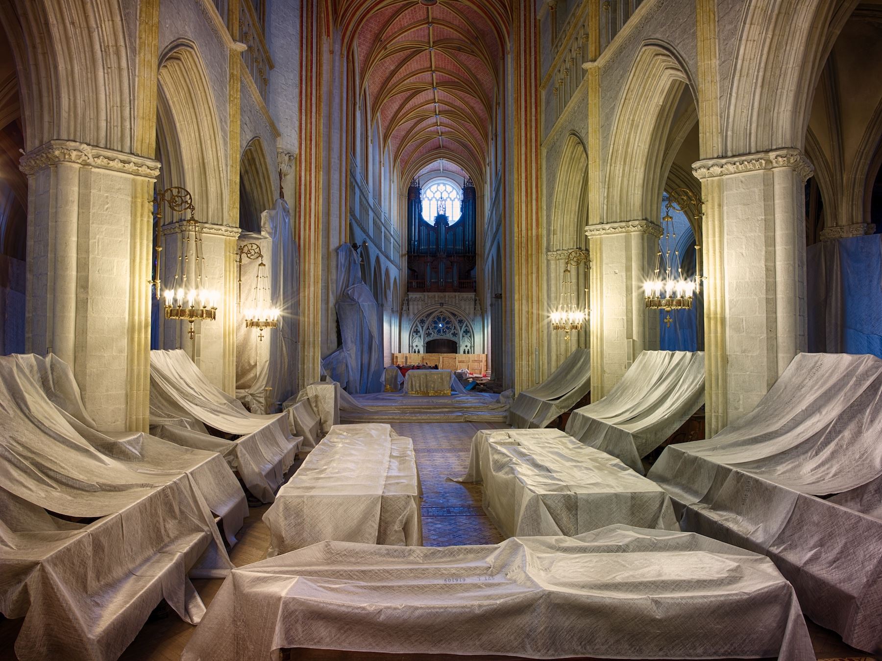 Depuis des siècles la cathédrale est là. Elle veille. Sa présence est immuable. Elle est admirée autant qu’ignorée, on passe à côté, parfois dedans, pour la sérénité, pour la beauté, pour la curiosité. Et puis soudain, quoique que de l’extérieur elle soit encore ce signe dressé, silencieux, immuable, un événement. La cathédrale est fermée, le lieu devient un chantier ! «Chantier interdit au public» le lieu enchanté. Là, l’édifice ancestral, qui laisse un peu indifférent devient, (redevient ?) signe interrogateur, il devient question, symbole… Quel drame se trame derrière les murs extérieurs, qu’advient-il de l’apaisante atmosphère intérieure, la lumière pacificatrice est-elle voilée, dénaturée, torturée ? Quelle tragédie se noue derrière le décor de théâtre que devient la façade ? L’inaccoutumé, l’inhabituel deviennent les vecteurs, les aiguillons de l’aspiration au sacré. Le caché attise la soif de vision.