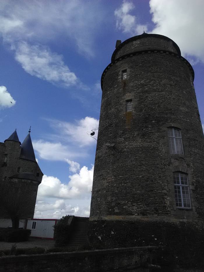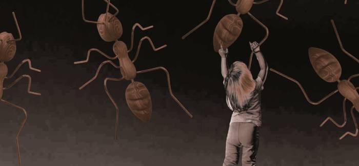 Pour l’installation Toile d’araignée, mon idée consistait à utiliser la hauteur. Ce n’est pas un insecte, mais dans ce petit monde du microcosme, l’idée des araignées était une évidence et la toile me permettait d’utiliser la hauteur. En outre, le public lève la tête pour voir les araignées et le bâtiment. C’est aussi l’intérêt des 3CHA et ce que ses organisateurs souhaitent mettre en avant. Valoriser autant l’art que le patrimoine. Ça fonctionne bien avec les deux installations ; et c’est la même chose pour les fourmis monumentales sur le donjon, à l’extérieur. Ce qui est génial reste que le donjon a une structure ronde, la fourmi se détache petit à petit. Contrairement à une surface plane où il faudrait être sur le côté, le monument permet au relief de se détacher.