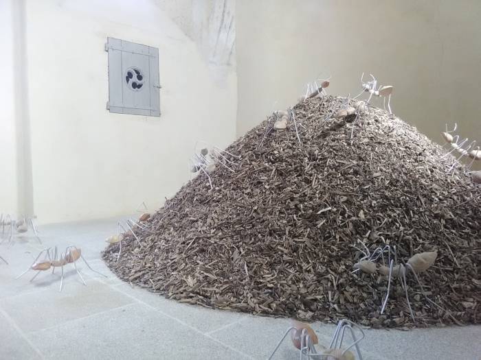 Marc Georgeault : Techniquement, on ne peut rien attacher aux murs, mais seulement sur les poutres. C’était une contrainte de plus. Avec Petites fourmis, la fourmilière m’est apparue comme une évidence. J’en avais déjà réalisé quelques-unes et la question de la multitude trottait dans un coin de ma tête. L’idée de créer une dimension mouvante par le son aussi. C’est une projection qui était un peu « en option » donc elle est volontairement discrète. L’importance du travail se fait autour des sculptures, c’est ce que je cherche à mettre en avant. C’est subtil, mais présent. L’installation prend vie et utilise la totalité de l’espace du chœur.