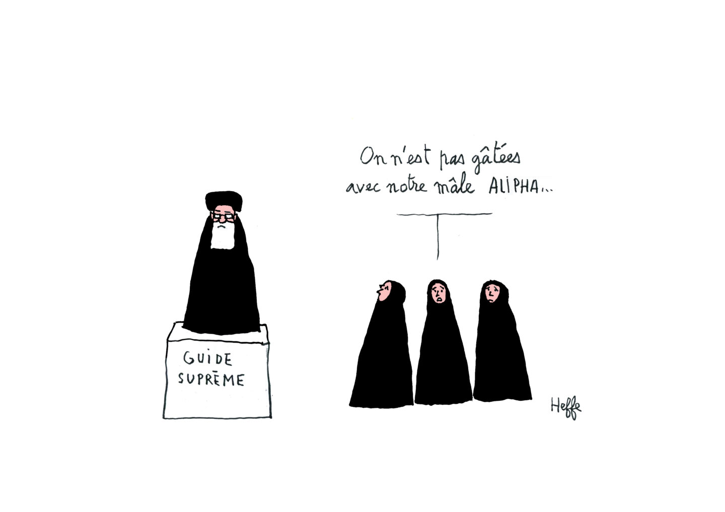 Le dessin de Michel Heffe fait ce que la propagande déteste, puisqu’il simplifie. On y voit un patriarche debout sur un piédestal, surmonté d’un titre qui dit tout, “Guide suprême”. En face, trois femmes réduites à une silhouette lâchent la phrase la plus douce-amère possible : “On n’est pas gâtées.” Le “mâle ALI-PHA” n’est pas seulement une pique pop, il désigne un système, une domination patriarco-religieuse érigée en gouvernance. Combien de temps le mal Ali-pha continuera-t-il son oppression ?