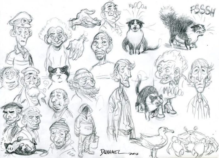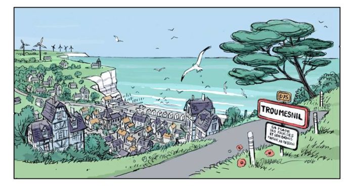 La légèreté c’est celle du dessin qui s’inspire des BD franco-belges des années soixante quand les colères s’exprimaient par des phylactères noirs de suie. Lorsqu’il dessine les personnages, le ressort humoristique prend le pas pour caricaturer des pêcheurs, des élus, des pompiers plus proches d’Achille Talon que de la réalité. Schématisé, interprété, s’appuyant sur des repérages de Quiberville à Varangéville, le dessin des paysages, comme celui de la couverture, alterne poésie et réalisme. Par des traits simples, Duhamel exprime parfaitement l’âme d’une région, de cette bande côtière qui de Trouville à Ault, expose sa blancheur crayeuse aux vents impétueux et aux pluies grises…
