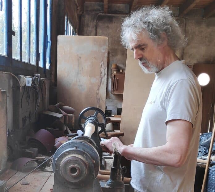 Bruno Guézennec a grandi dans l’atelier de la Tournerie du Viaduc, au milieu des scies et du tour de bois transmis de génération en génération. Cette histoire familiale débute en 1935, lorsque son grand-père, Auguste Guézennec, ouvre la Tournerie. L’entreprise est alors spécialisée dans la menuiserie et la fabrication de meubles anciens. Elle sera reprise par son fils qui formera Bruno Guézennec pour finalement y succéder en 1986. « Mon grand-père a fondé l’atelier. Il faisait à l’époque du tournage sur bois. Il fabriquait des meubles, des pieds de table, des buffets, des barreaux d’escalier et aussi des sculptures. J’ai toujours connu cet endroit. J’ai commencé à donner un coup de main à l’âge de 14 ans, puis j’y ai travaillé dès les années 70 car cela me plaisait. »