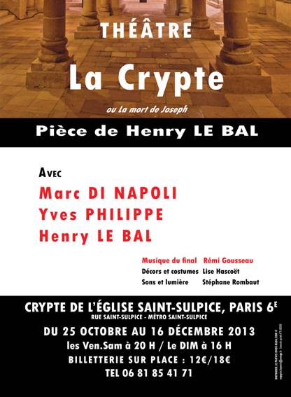 La Crypte, la mort de Joseph est la nouvelle pièce d’Henry Le Bal. Ballet mystérieux de personnages et de mots qui ne résonnent plus en surface. Dans la crypte d’une église qui menace de s’effondrer, un ouvrier spécialiste du bois surnommé Joseph vient inspecter les colonnes. Il fait la rencontre d’un homme singulier, reclut dans une barque. Il propose à Joseph une bien étrange activité : écouter et transcrire les voix qui remonte du purgatoire le long d’une colonne, composer un poème salvateur avec les dernières phrases des âmes…