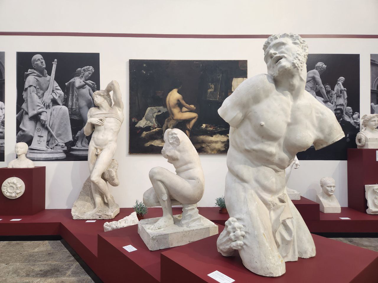 Le temps d’une exposition, le patio du musée des Beaux-Arts de Rennes revêt son manteau d’autrefois. Dans un agencement habillé par la profondeur de la couleur pourpre du mobilier, le public est accueilli par des sculptures, elles-mêmes encadrées par des peintures grand format et des photographies d’archives qui se font face. Ancien lieu convivial où l’on pouvait s’asseoir, l’espace abrite temporairement des tables en bois ici et là, avec comme compagnie ces personnages de peinture ou de marbre qui nous entourent, révélant la majesté de la création.