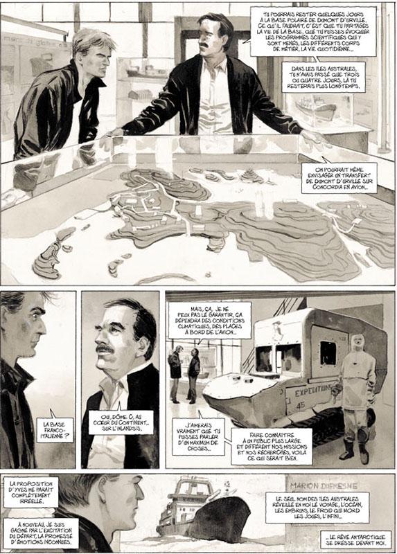 Emmanuel Lepage : Le livre a été construit autour du point nodal qu’est l’arrivée à la base polaire de Dumont d’Urville quand on nous demande de choisir lequel des deux part sur le raid. Afin de donner toute la force à ce passage il fallait en amont le « préparer ». Il fallait donc « lâcher » un certain nombre de chose sur notre relation, les rivalités, l’admiration réciproque, les complicités créatrices qui nous portent. C’est sans doute ce qui était le plus difficile à raconter. Il fallait être au plus près, au plus juste.