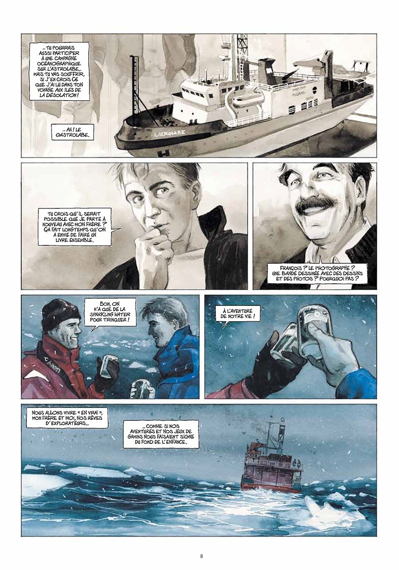 Emmanuel Lepage : Avant même d’écrire et de mettre en scène quoi que ce soit, j’ai demandé à François de faire une sélection des photos qu’il souhaitait voir dans le livre. Nous avons resserré ensemble la sélection, car certaines, quoique très belles, étaient redondantes. J’ai construit alors le récit autour de ces photos afin qu’elles s’inscrivent dans le fil narratif et qu’elles prennent toute leur force. Nous ne devons jamais perdre de vue que nous racontons une histoire et qu’il ne s’agit pas d’un livre de photos.