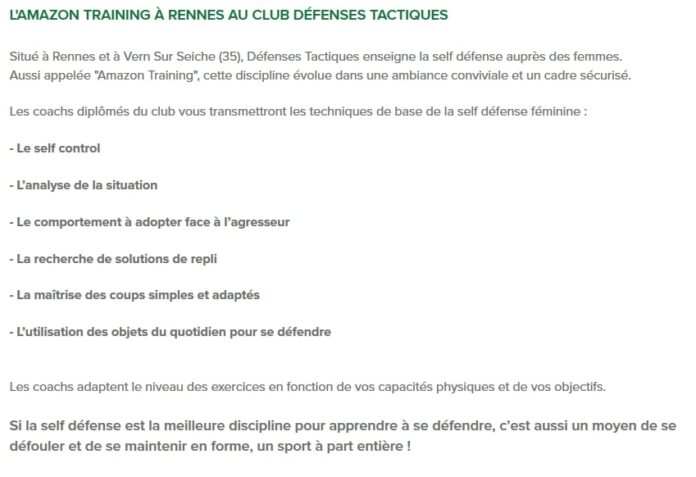Cours d’Amazon Training le mercredi de 19h à 20h15 et le jeudi de 18h30 à 19h45 à la salle St Thérèse près de l’église. D’autres cours de self défense et de boxe pour tous les niveaux sont également proposés par l’association défenses tactiques de Rennes. Renseignements au 06 43 68 89 31.