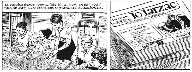 Rares parmi les premiers acteurs de l’époque sont ceux qui imaginent alors la portée et la durée de leur combat. Le récit des auteurs scrupuleusement chronologique, et parfaitement illustré du trait noir et précis, quasi photographique, de Sebastien Verdier, montre comment l’action de quelques éleveurs de brebis déterminés, enfle, gonfle tel un ballon de baudruche et s’empare bientôt d’une grande partie de la société. La richesse de la BD tient notamment à cette capacité à montrer le caractère hétéroclite des opposants qui vont bientôt se retrouver par dizaines de milliers chaque été au moment des moissons organisées sur les terres de l’armée. Les paysans regardent d’un mauvais oeil, et même parfois du bout de leur fusil, ces jeunes aux cheveux longs qui déclament bêtement leur credo idéologique en criant: « La bouse de vache est plus utile que les dogmes. On peut en faire de l’engrais a dit Mao ». Comme sur le marché de Millau, on trouve de tout dans la contestation. Mouvement occitan et régionaliste, féministe, écologiste, maoïste, pacifiste, se côtoient avec des objectifs et des méthodes d’action parfois opposés. Mais le combat dans sa globalité, peut être parce que les partis politiques sont à l’écart, transcende ces différences, y compris celles entre les paysans originels et les néos venus s’installer pendant le conflit pour un autre mode de vie.