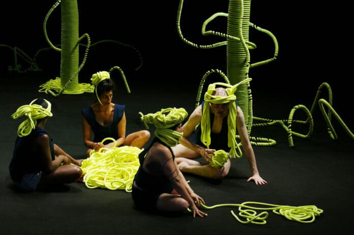 Latifa Laâbissi – Nadia Lauro a proposé la forêt et le côté forêt brûlée post-apocalyptique et science-fiction m’a rapidement plu, mais je ne voulais pas que les interprètes soient seulement posés dans un décor. J’ai demandé à Nadia un maximum de lianes afin que l’on puisse imaginer tout un éventail de propositions etque l’on puisse travailler avec elles.