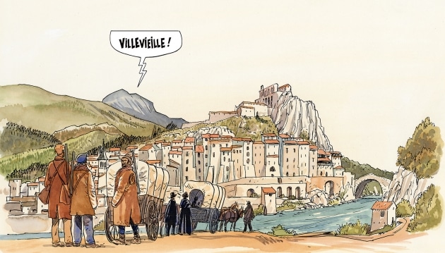 Elle éclate partout la lumière, dans cette BD qui, même située par l’écrivain dans un pays imaginaire, renvoie aux paysages des Alpes omniprésents dans l’oeuvre de Giono. Il y’a la Durance, Sisteron, dans ces décors que Ferrandez étale sur des doubles pages magnifiques comme si ces paysages étaient l’essentiel de l’oeuvre. De grands dessins à l’aquarelle finement ciselée pour remplacer les mots du romancier, les descriptions imposantes de la nature. On y voit la magnifique blancheur hivernale, la tendre douceur printanière ou l’orange feuillage de l’automne. Ces aquarelles sont le socle du travail de Ferrandez. Dessus, superposées, viennent s’ajouter des vignettes modestes, petits espaces dans lesquels se racontent des choses moins importantes: la vie des hommes. Soumise à la pluie, aux saisons, au vent, aux torrents, elle est modeste, mais lourde. Elle lutte à la fois contre les grands éléments et contre les passions.