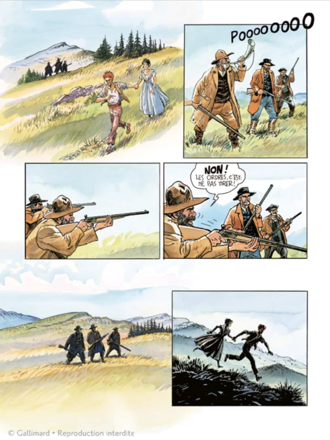 Ferrandez qui blanchit souvent l’arrière-plan de ses cases, lorsque la nature n’intervient pas, pour donner plus de poids à ses personnages, a su garder de Giono les phrases clés, magnifiques, merveilleuses, celles qui dépassent une époque ou un lieu, qui donnent la parole à ces êtres ensorcelés par leur naissance. En gardant l’essentiel, le dessinateur donne à voir le style du romancier. Le texte de l’écrivain est bien présent et s’impose sur les pages. Partout la mort règne, les armes à feu crépitent, la violence explose, les saisons donnent le rythme à l’existence des hommes, mais la vie au final l’emporte. Si Giono ne détestait pas le dramaturge anglais, on aurait pu parler de drame shakespearien, loin d’une romance à la Roméo et Juliette, mais tellement proche du drame du Roi Lear.