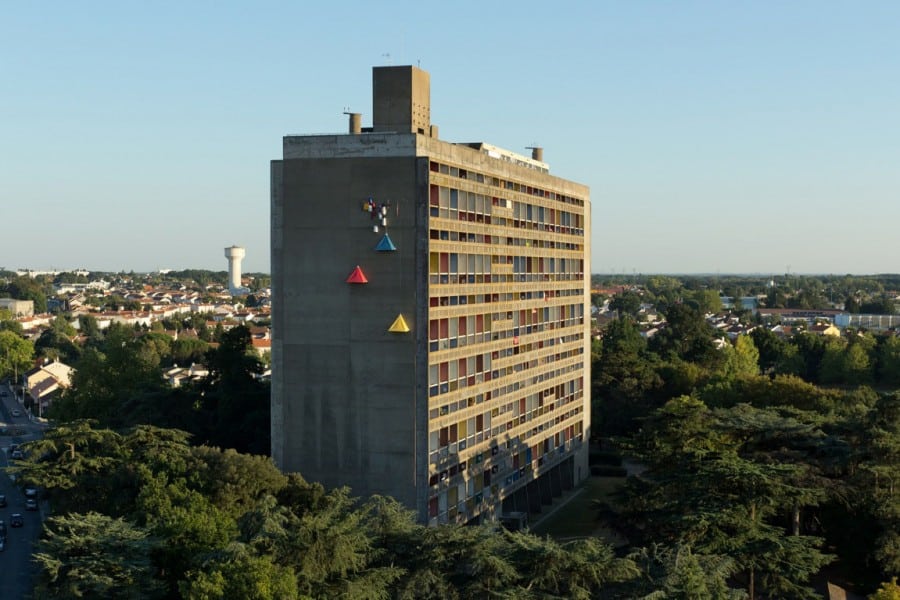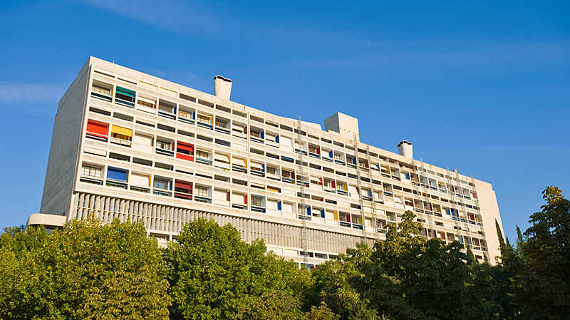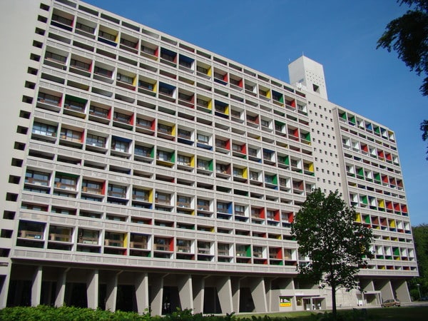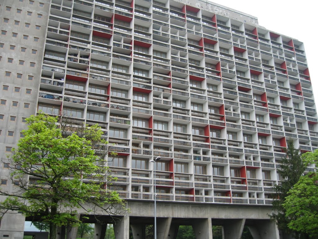 Après la Libération, la vague de l’épuration l’épargne. Mieux, même : ses conceptions architecturales – bâtiments en béton de très grande hauteur, lignes horizontales parfaitement rectilignes…- vont être mises en œuvre dans les années 50 et suivantes avec l’appui politique et administratif des responsables de la reconstruction et de l’aménagement du territoire. Se dresseront ainsi les grands ensembles péri-urbains de l’après-guerre, « d’une uniformité désolante » (Xavier de Jarcy). Ainsi que les fameuses « Cités Radieuses » à Marseille, Rezé, Briey, Firminy et Berlin, qui fixent les populations, brisent le nomadisme urbain, qu’il a toujours détesté, et font du bâtiment un village vertical, avec son aire de jeu sur le toit, son école, ses rues intérieures, ses commerces, ses équipements sportifs, le tout créant