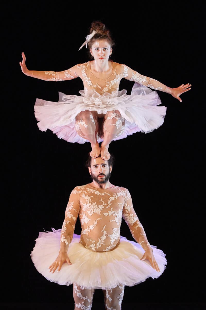 La metteuse en scène s’est inspirée de sa propre expérience avec la danse aérienne, où elle évolue en harmonie avec des tissus, des cordes et des hamacs pour se suspendre : « J’ai même utilisé du grillage pendant un moment, mais ça faisait très mal », confie Florence. « J’aime beaucoup les corps qui volent, qui chutent, qui se rattrapent. » Selon elle, le cirque offre une manière unique de prolonger et d’intensifier le mouvement dansé.