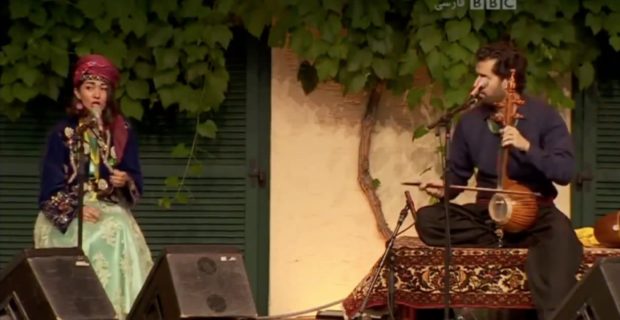 Sans doute pour ne pas écorcher nos très occidentales oreilles, c’est très progressivement que Sohrab Pournazeri va apprivoiser l’auditoire par une mélodie étrange qui semble nous raconter une histoire triste. Elle est jouée sur un luth à long manche, le tambûr avec la dextérité d’un guitariste de flamenco. Il est peu à peu rejoint par Hussein Zahawy, qui ne se révèle pas moins adroit et démontre toutes les nuances possibles d’un instrument à percussions. Calme au départ, cet air va monter en puissance, il parait avoir pour destination de faire entrer en transes. L’incroyable virtuosité des deux exécutants est époustouflante et prépare avec adresse l’arrivée des autres membres du groupe.