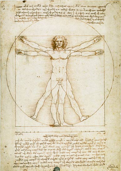 Pour Léonard, qui aurait pu être aussi un bâtisseur, le corps a les proportions parfaites d’une architecture, reprenant l’idée de Vitruve qui comparait les proportions du corps aux rapports architecturaux. Léonard en fera une représentation devenue son dessin probablement le plus célèbre, où l’homme, bras tendus, s’inscrit dans un carré, et, bras et jambes écartées, dans un cercle dont le nombril serait le centre.
