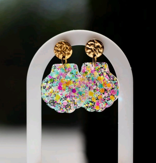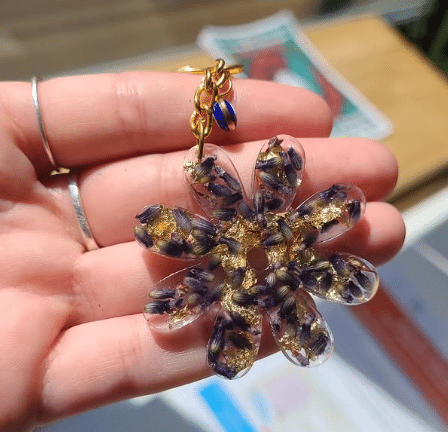 L’univers de Lisa de l’Atelier Distrait se développe quant à lui dans la création de joyeux bijoux colorés, fabriqués en résine époxy. La matière transparente lui permet de laisser place à sa créativité : « J’y incorpore pétales de fleurs séchées provenant des jardins de mes grands-mères, un clin d’œil à la nature qui m’est cher et surtout aux fleurs qu’on aime tant », explique la créatrice. Après avoir triées et colorées les pétales une à une, elle conçoit un bijou frais et élégant qu’elle choisit elle-même de ne pas genrer afin qu’il puisse être porté par tous et toutes.