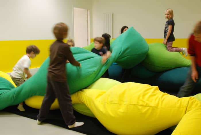 Ensuite, j’évoquerai le projet « Pillow ». Il montre aussi bien la liberté d’usage inhérente à notre travail que l’aspect ludique et modulable. Ce projet est le résultat d’une invitation du Centre Pompidou-Metz, pour les Ateliers jeunes publics (2011). Le centre culturel nous a proposé une carte blanche pour un projet sans thème préétabli. La cible, le jeune public, a constitué notre inspiration principale. En nous replongeant dans notre enfance, nous avons imaginé le terrain de jeu idéal. De nos recherches et inspirations sont nés ces gros coussins de 4m50 remplis de polystyrène. Une seule forme peut se décliner en plusieurs usages possibles. Pillow a été imaginé comme lieu de repos et espace de jeu de construction puisque les enfants peuvent les déplacer à plusieurs et créer de nouvelles formes. Il a été exposé plusieurs fois et nous avons pu découvrir de nouveaux usages : écouter la musique, danser, etc.