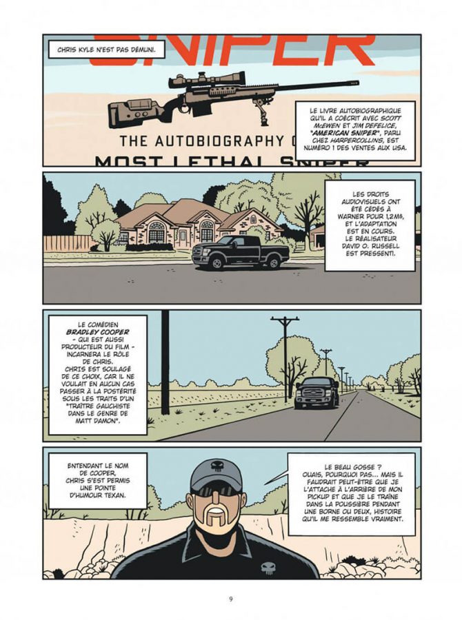 Clint Eastwood, dont une citation d’un de ses films ouvre chaque chapitre, porté par son idéologie patriotique donne dans son drame une vision manichéenne de Chris Kyle héros de l’Amérique. Nuri et Brüno évitent ce piège et invitent plutôt le lecteur à réfléchir. La femme de Chris Kyle qui prend une place importante après la mort de son époux, devient le personnage central du malaise qui nous saisit. Veuve sincère, elle occupe les plateaux de télévision, écrit des best-sellers, tourne des spots publicitaires pour des industriels d’armes, gagne beaucoup d’argent. Ses larmes et ses propos laissent un goût amer dans la bouche, entre opportunisme et détresse. Cette sécheresse déstabilisante est amplifiée par un dessin gardant souvent le cadrage d’images réelles, amplifiant le caractère de reportage. Le texte lui même utilise toute la liberté possible qu’offre la Bande dessinée. Dialogues hors des cases, texte en colonne, petit texte en blanc sur un large fond noir, la richesse graphique est immense et donne un caractère unique au travail d’enquête minutieuse effectué.