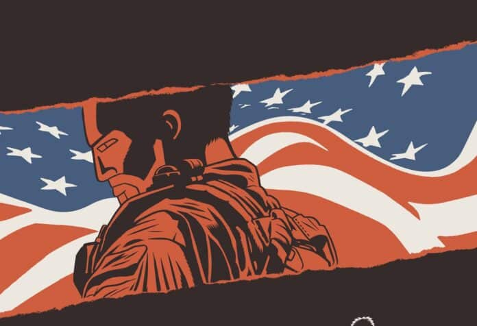 Les auteurs ont choisi la voix documentaire, utilisant en voix off, les documents écrits, filmés, recensés lors de leur enquête. Intacts, sans modifications, ces mots recopiés ajoutent au caractère glaçant de l’histoire de ces deux êtres si proches l’un de l’autre au départ, mais dont les destins vont finalement diverger. Chris Kyle a connu des traumatismes, mais il va les surmonter pour en faire une force. Ray Routh, sans mort à son « compteur », n’aura pas la gloire comme béquille. Par le traitement graphique magnifique et un scénario millimétré, les auteurs racontent le fait divers d’un assassinat parmi d’autres. Interviews télévisées, images embarquées de caméras policières, témoignages au procès nous emmènent dans un « Faites entrer l’accusé » américain, avec toute la rigueur voulue et la recherche de neutralité. Mais la personnalité de Chris Kyle, le contexte historique d’après 11 septembre donnent au fur et à mesure des pages une nouvelle dimension au récit. C’est un véritable portrait de l’Amérique avec toutes ses contradictions et ses fantômes qui apparaît sous nos yeux. Le rôle et la fascination pour les armes, la drogue, le traitement des soldats traumatisés au retour de leurs missions, le culte d’un pays supérieur aux autres, le discours omniprésent de la religion et d’un Dieu omniscient, les médias, leur duplicité financière, sont ainsi exposés à notre lecture.