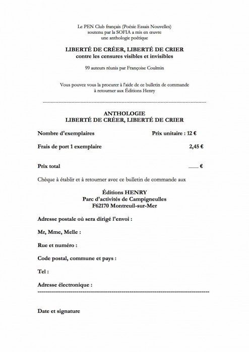 Liberté de créer, liberté de crier, anthologie poétique réunie par Françoise Coulmin / Pen Club français, vignette de couverture de Isabelle Clément, Editions Henry (collection Ecrits du Nord), 128 pages, 12 €.