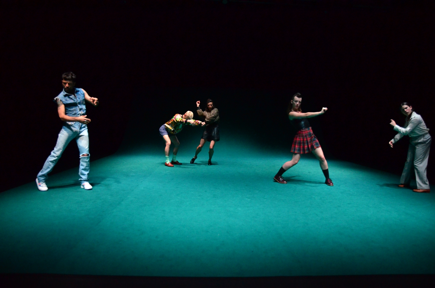Puis dans une savoureuse symbiose, les corps se creusent avant de se tordre en choeur dans une imperceptible lenteur. Les costumes typés very british style sims 80’s, comme des fleurs, accentuent les singularités. La lumière est faible. En chœur, les corps se mettent à rebondir, montés sur ressorts… Twing, twing, twing : la bande-son vient scander l’étrange bruitage grinçant d’un vieux sommier aux ressorts rouillés, évoquant inévitablement… les ébats amoureux. Tous les membres et les visages des danseurs rebondissent du grotesque à l’érotique. Les saccades durent et deviennent maladives par leur accumulation.