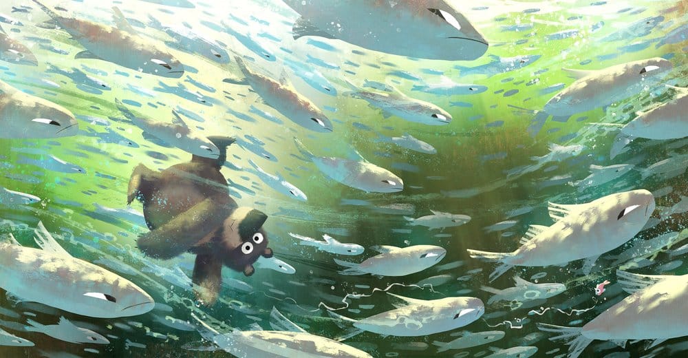 La rencontre tout sauf triste d’un ours affamé et d’un petit poisson loin de chez lui… C’est l’histoire d’une rencontre. Une rencontre entre un ours affamé et un petit poisson qui remonte la rivière pour rentrer chez lui. L’issue pourrait être fatale…