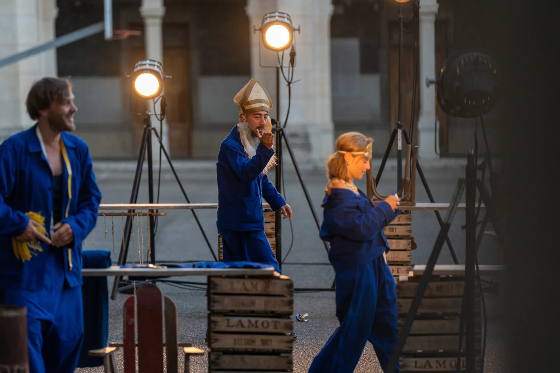 « Ça fait 25 ans qu’on travaille surtout hors les murs. On n’avait pas envie d’être enfermés », commence à raconter Waas Gramser. « On a découvert un monde. On aime être dehors toute la journée pour les répétitions. Quand on joue hors les murs, il y a toujours la réalité qui entre dans le spectacle, la météo, le passage, l’environnement sonore. Une salle est conçue pour exclure la réalité quotidienne. Hors les murs, on a vraiment embrassé l’imprévu de la vie quotidienne, la normalité. On aime que la vie continue, pour désacraliser le théâtre. On veut retenir l’attention du public par le jeu, le texte, l’usage de l’espace. Et pas s’appuyer sur le code formel de la lumière qui s’éteint où vous êtes supposés vous taire et nous, parler. C’est trop facile. »