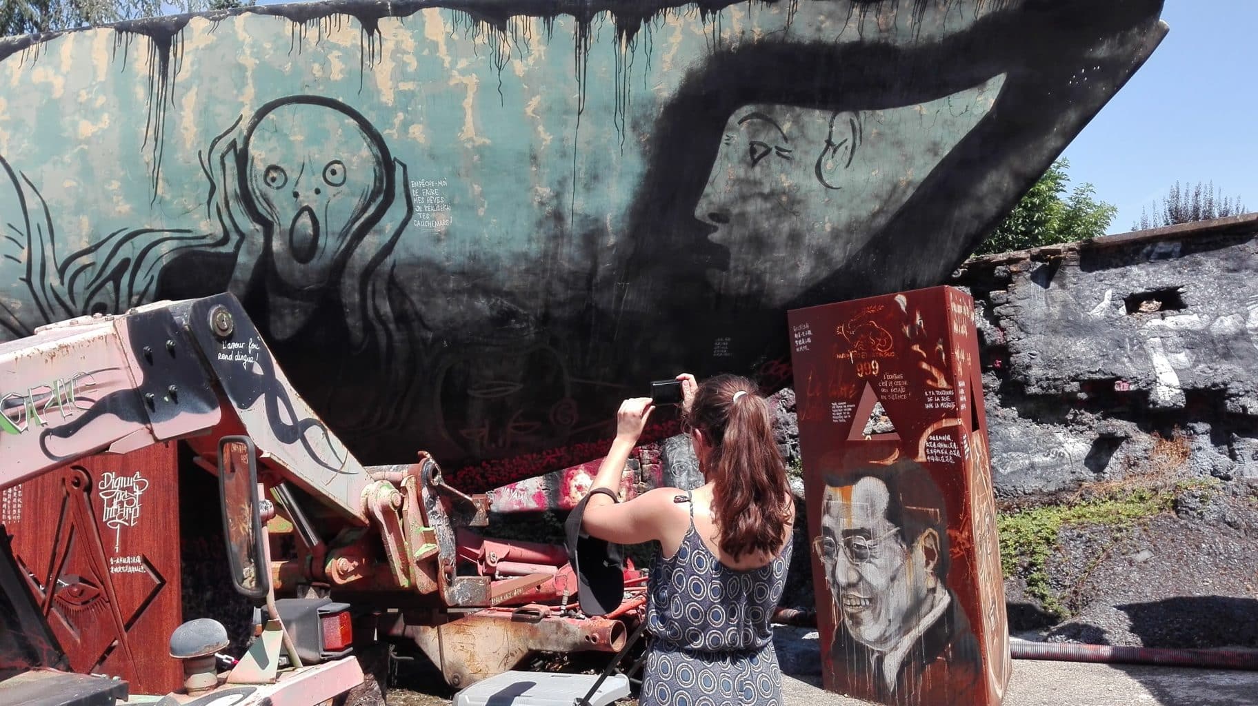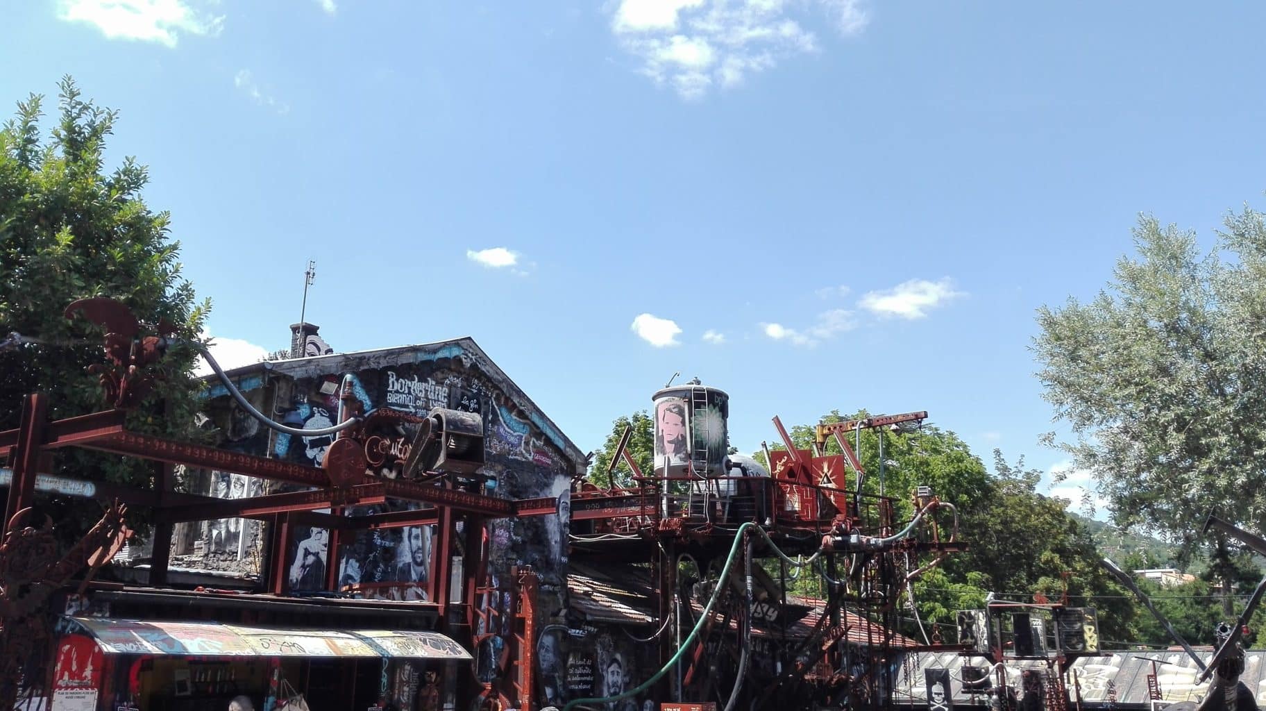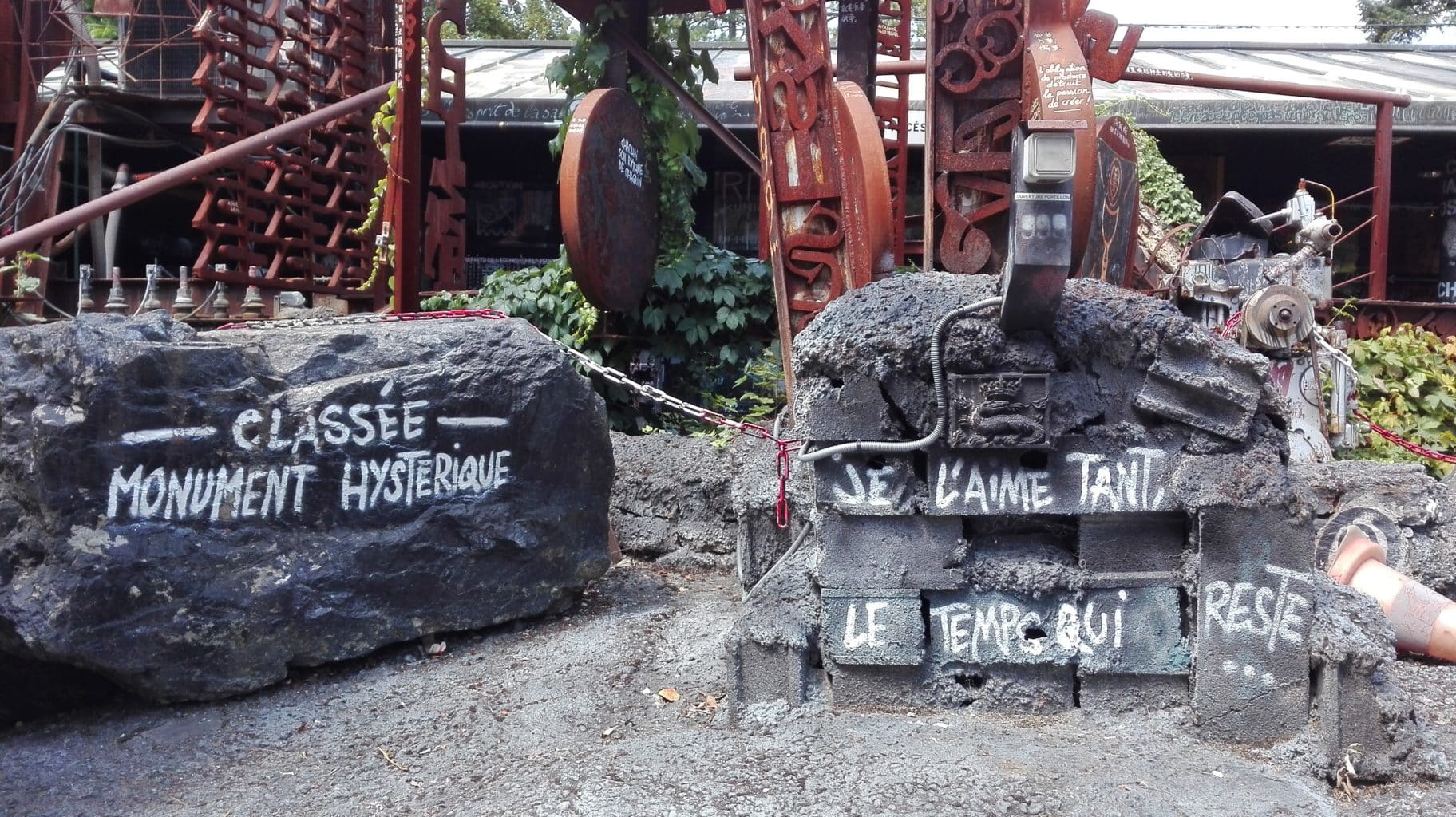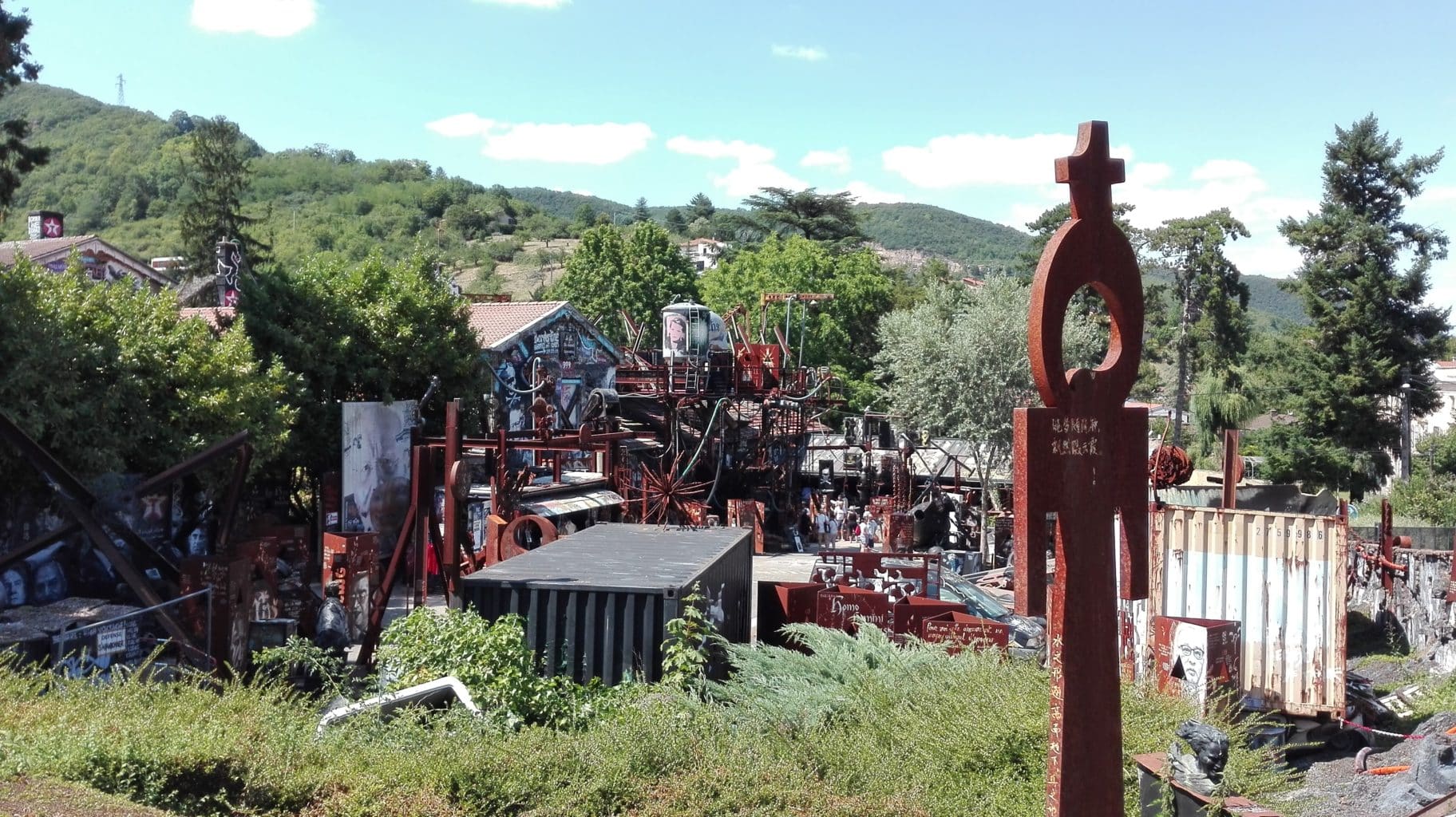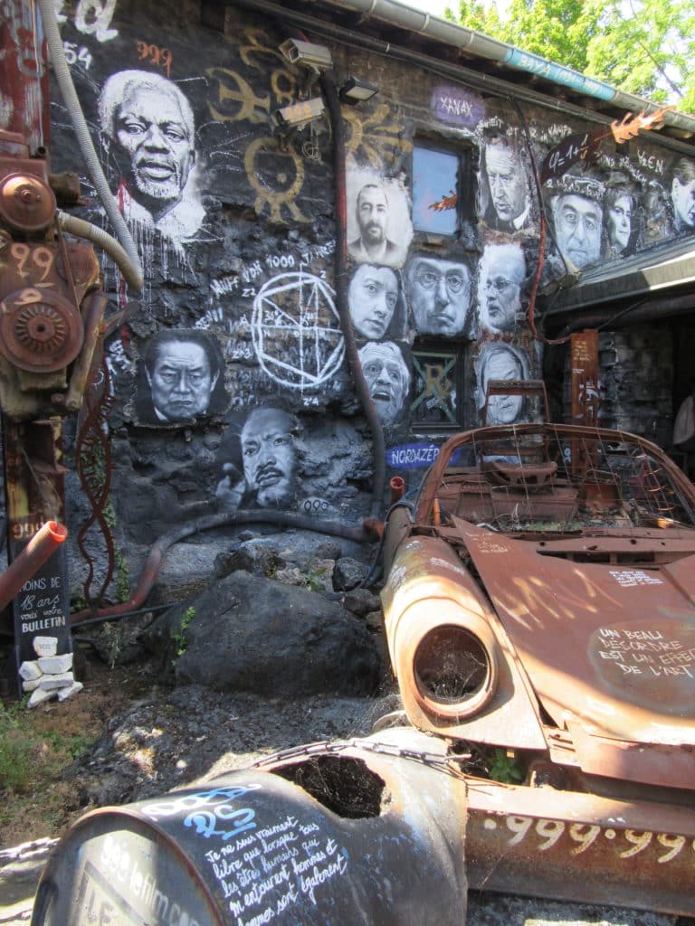 En tant que Rennais, on ne peut s’empêcher de comparer cet antre artistique à une version développée de l’Élaboratoire : un projet artistique hors du cadre institutionnel, une liberté de création totale et une volonté revendicatrice. Derrière le portail se cachent plus ou moins discrètement monticules d’objets et matériaux de l’ère industrielle — cabine téléphonique, carcasses de voitures, télévisions cathodiques, coque de bateau, fuselage d’avion, etc. — qui transforment ce paysage classique en monde d’après bombe nucléaire.