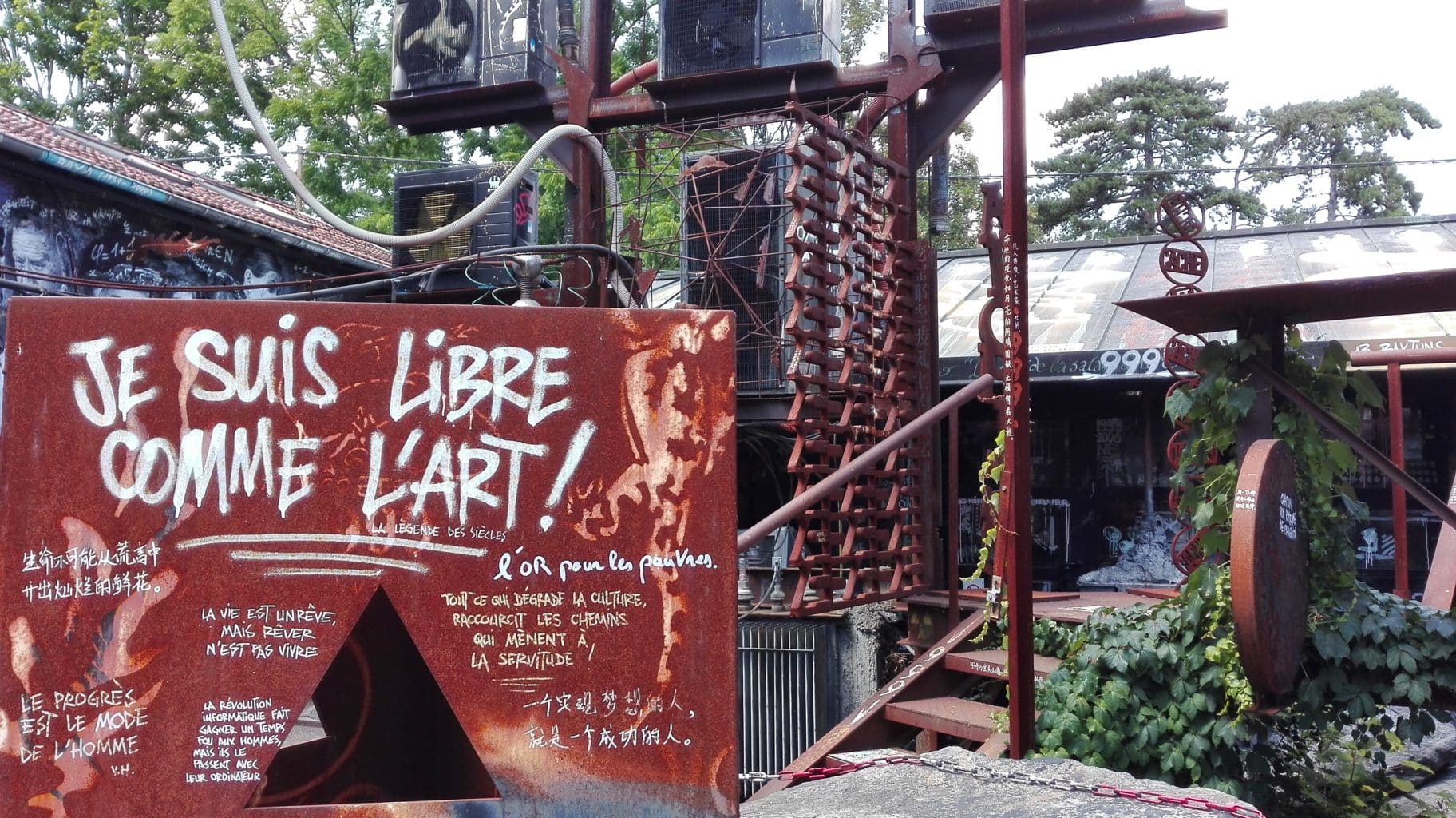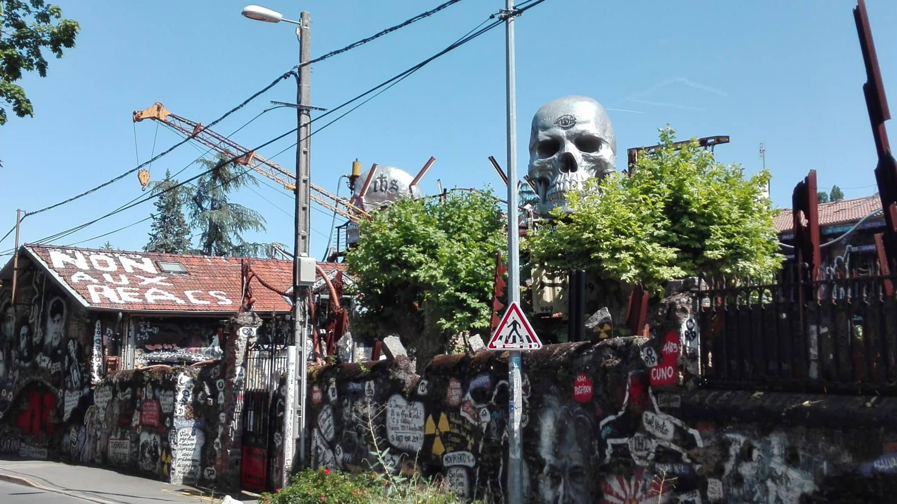 À la sortie de Lyon, prendre la direction de Saint-Romain au Mont d’or, petit village bourgeois au cœur des Monts d’or… Dans un quartier résidentiel aux maisons de pierres dorées, écritures revendicatrices et graffs tapissent les murs extérieurs d’une propriété aux allures de bâtiment désaffecté. Derrière cette muraille de pierres, deux immenses crânes argentés surgissent d’entre les arbres et ne peuvent qu’interpeller… Depuis 20 ans, cet ancien relais de poste du XVIIe siècle abrite en son sein un univers fantasmagorique :La Demeure du chaos, musée d’art contemporain à ciel ouvert.