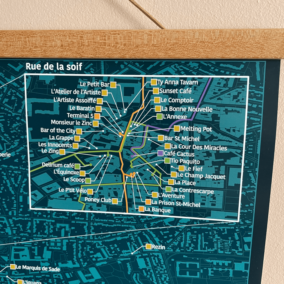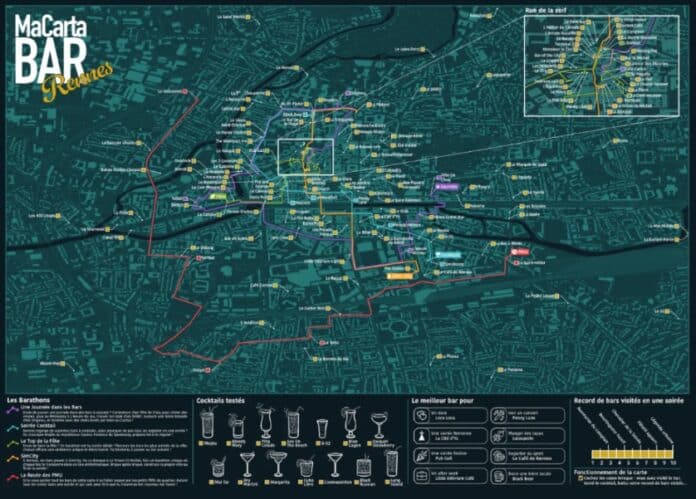 Si vous êtes perdus face à autant de possibilités, n’ayez crainte, la carte dispose aussi de conseils. Dans la légende se trouvent deux catégories : “Les barathons” désignent un ensemble de bars à faire en une soirée. Ils sont basés sur un thème comme les bars festifs ou cocktails ou la route des PMU afin d’expérimenter non seulement les grands bars, mais aussi les bars de quartier. Dans “Les suggestions”, les personnes trouveront des endroits pour manger des tapas, voir un concert, faire une soirée bretonne.