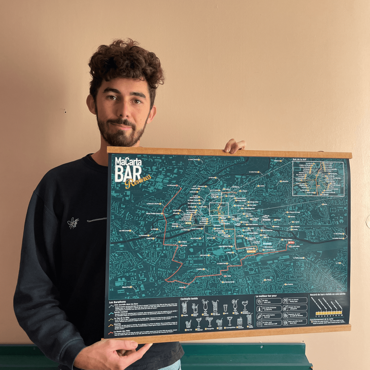 La graine s’est plantée dans l’esprit de Glenn Louarn il y a 3 ou 4 ans, quand il est venu s’installer à Brest, dans le Finistère, avec son amie. Pourquoi ne pas découvrir la ville en explorant ses bars ? Mais, constat étrange venant de la Bretagne, il n’existe aucune carte qui les répertorie… Laissée dans un coin de sa tête, elle a germé après une maturation de plusieurs mois – la fin de ses études d’ingénieur, un travail d’un an et un voyage de huit mois – à son retour fin mai 2024. « J’avais envie d’entreprendre, de ne plus être salarié », raconte le jeune homme. « J’ai travaillé dessus cet été pour recenser tous les bars et trouver un design sobre et compréhensible. » Google maps a été son meilleur ami durant cette période, les pages jaunes également, et ses amis aussi.