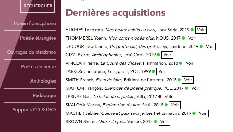 Lucie Desaubliaux, médiatrice scolaire, souligne que l’équipe fait régulièrement de nouvelles acquisitions et propose une sélection de livres chaque mois. Pour juin, Quentin Leclerc conseille le troisième numéro de la revue bilingue franco-allemande La Mer gelée. « On y trouve une réécriture de poèmes à partir de deux chansons du groupe Gold, que j’aime beaucoup. Et aussi une nouvelle très marrante sur des joueurs de water-polo qui deviennent super fort quand l’un d’eux pisse dans la piscine ». Le coup de cœur de Lucie Desaubliaux est le recueil Sans adresse de Pierre Vinclair. « Le poète utilise la forme classique du sonnet pour raconter du moderne, le quotidien, la rue… Sa poésie n’est pas hermétique et on n’aborde pas le sonnet de façon classique ». Ces conseils de lecture sont proposés pour permettre à chacun de découvrir de nouveaux auteurs et de se plonger dans la poésie contemporaine, méconnue du grand public.