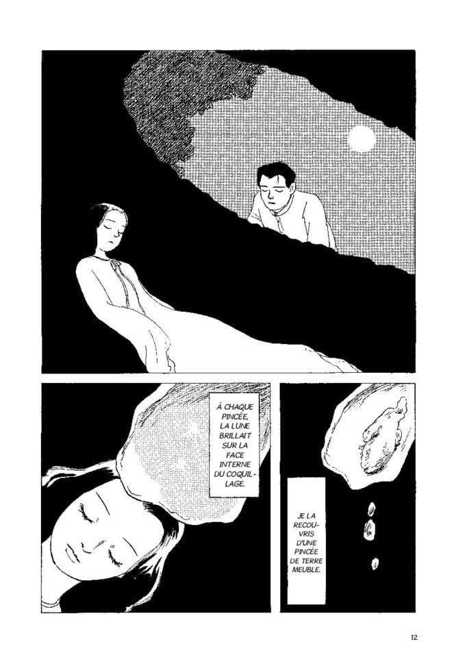 Durant dix nuits, l’amour côtoie la mort et la tragédie submerge les pages encrées. À la fois sombre, poétique et insolite, les ténèbres se terrent dans un coin — dans une forêt, une chambre, un bateau… – et surgissent dans la simplicité du trait de Kondô Yôko. La mélancolie de l’écriture pré-moderne de Natsume Soseki se transmet alors et s’épanouit dans des dessins sans fioritures. Le contraste du noir et du blanc, le travail de la lumière et l’obscurité, accompagne le texte sans prendre le dessus sur l’histoire, une neutralité graphique qui peut désarçonner les adeptes de manga au premier abord. Souvenirs enfouis, désirs cachés… chaque nouvelle se trouve à mi-chemin entre des morceaux de vie capturés et des contes moraux, une adaptation entre la réalité et le fantastique.
