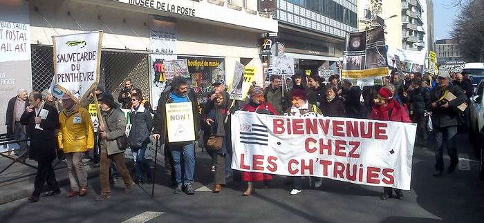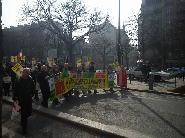 politiques étaient bien absentes dans ce sujet sociétal qui devraient les concerner. Après de longues minutes à descendre la rue Lecourbe, quasi déserte en ce dimanche d’hiver, le cortège a atteint la porte de Versailles et a été accueilli par les derniers visiteurs du salon et un bel alignement de cars de police, plus mobilisée par la circulation que par la violence des joyeux manifestants qui criaient des slogans dans tous les sens au son des cloches et des klaxons.