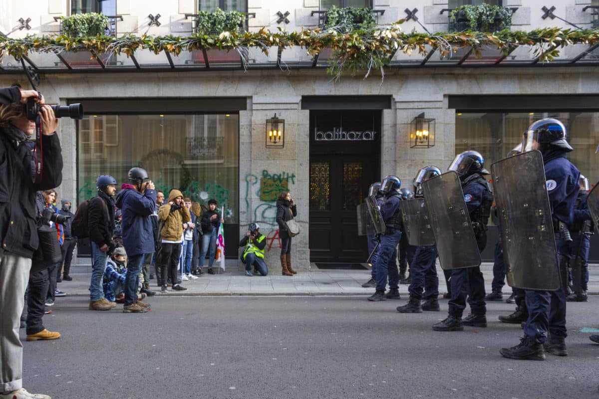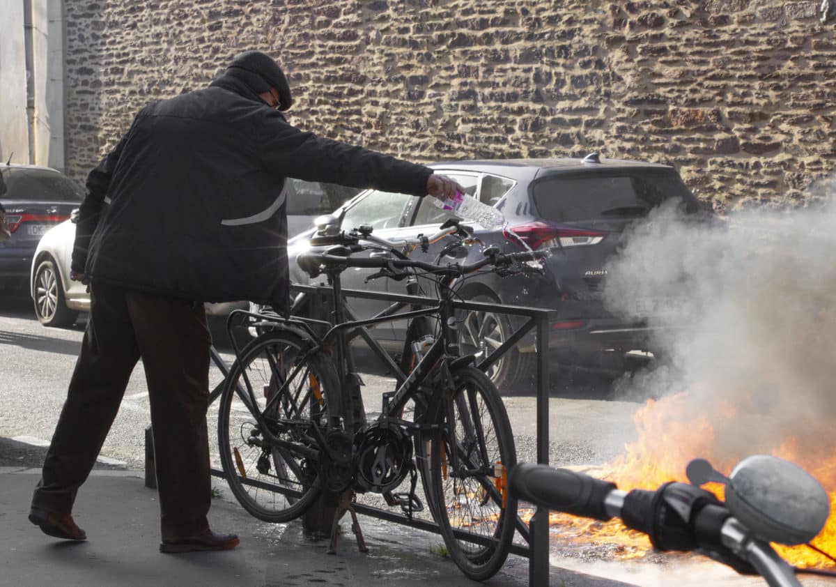 Ironiquement des poubelles brûlent devant des centaines de pompiers impassibles. De l’autre côté du feu, les CRS attendent. Sans surprise, les façades, visées par les « casseurs » sont les banques, les agences immobilières et les assurances. Deux 4×4 garés sur le boulevard n’échapperont pas au cortège. Plus loin, place de Bretagne une fanfare se fait applaudir : l’ambiance est à la fête.