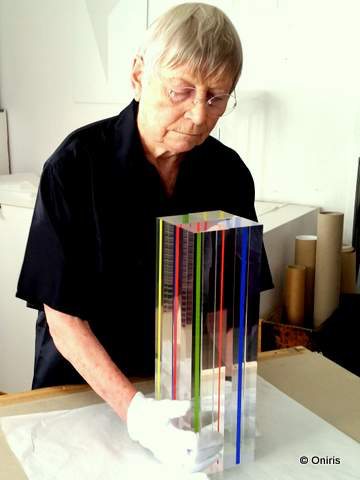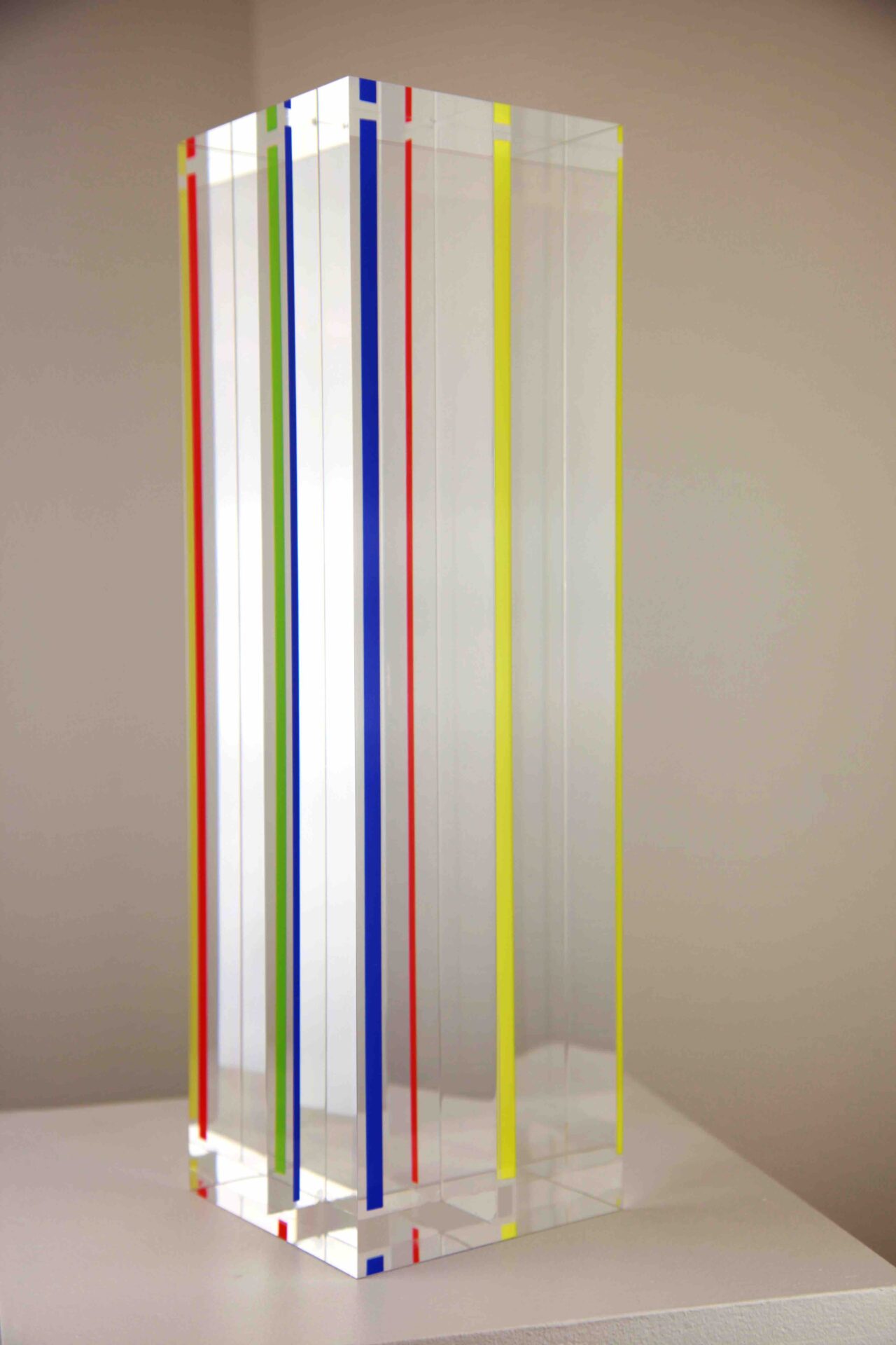 Passionnée par le fait de créer des illusions, c’est naturellement qu’elle passe de la peinture à la sculpture en plexiglas – support qui soutient pleinement ses préoccupations autour de la couleur et de la lumière. L’encre sérigraphique utilisée fixe la couleur pour un résultat sans trace où aucun parasite ne trouble la vision, dans le prolongement parfait de son travail pictural.