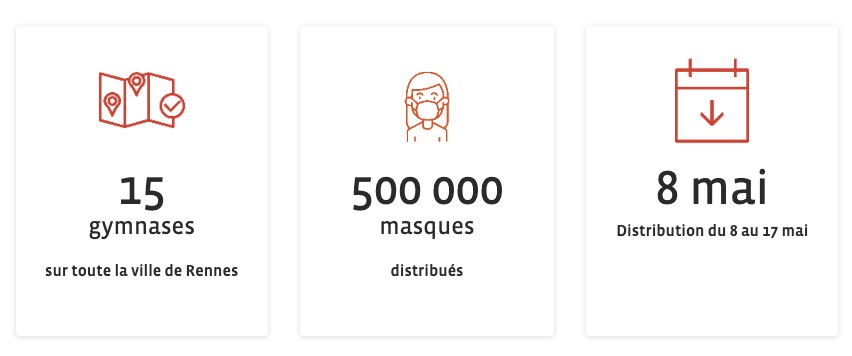 La Ville de Rennes distribuera 250 000 masques à ses habitants, sur le total de 550 000 unités commandées. L’autre moitié de la commande équipera 36 communes de Rennes Métropole et 59 autres communes brétilliennes. Chaque commune concernée se charge d’organiser les modalités de mise à disposition de ces masques à ses habitants et d’en informer sa population.