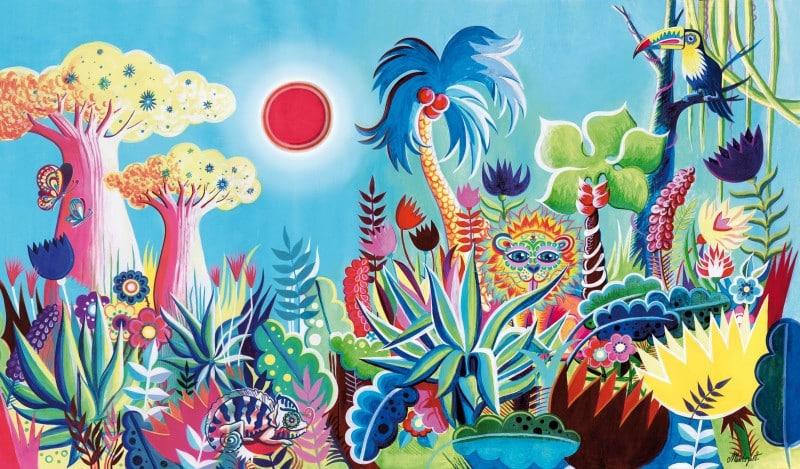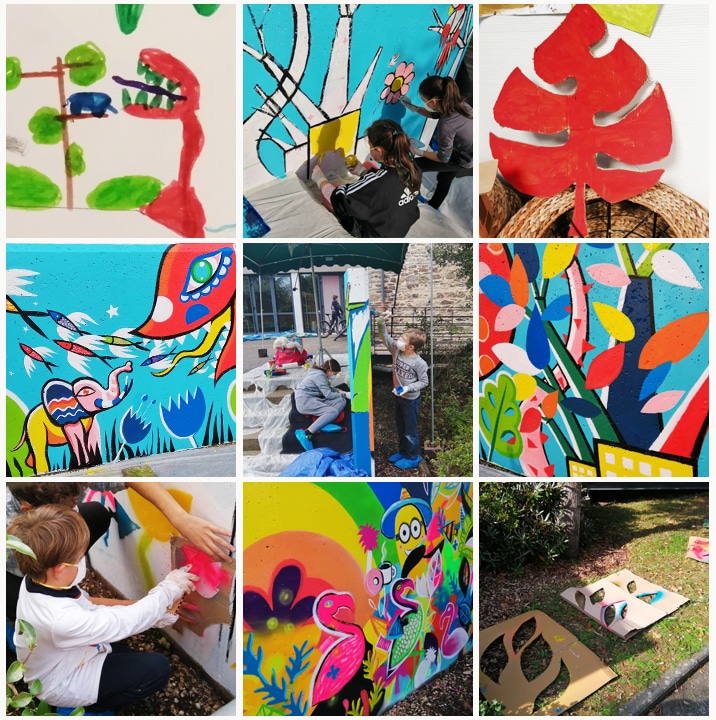 Misst1guett – Il y a deux ans, mon fils est né avec une malformation cardiaque. Mon mari et moi nous nous sommes retrouvés régulièrement à la maison des parents (un espace d’hébergement parental) du CHU de Nantes. Pour redonner de la couleur au lieu, le CHU m’a proposé de réaliser une fresque. J’ai donc fait La jungle en m’inspirant de l’oeuvre du Douanier Rousseau. J’aime rendre ces espaces médicaux ou pour enfants davantage joyeux. On ne peut pas peindre de fresques en milieu médical, les émulsions de la peinture peuvent être dangereuses, la matière doit respecter des mesures d’hygiène. Je réalise donc une illustration, qui est ensuite imprimée sur du papier peint, puis celui-ci est collé sur les murs.