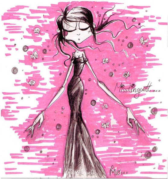 Misst1guett – Lors de mes études, je dessinais un petit personnage filiforme qui me suivait partout. Comme un ami m’appelait toujours « Misstinguett », j’ai baptisé mon petit personnage ainsi. Ce dessin est devenu ma marque de fabrique et son nom est devenu mon surnom d’artiste !