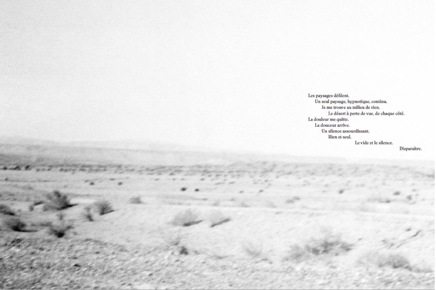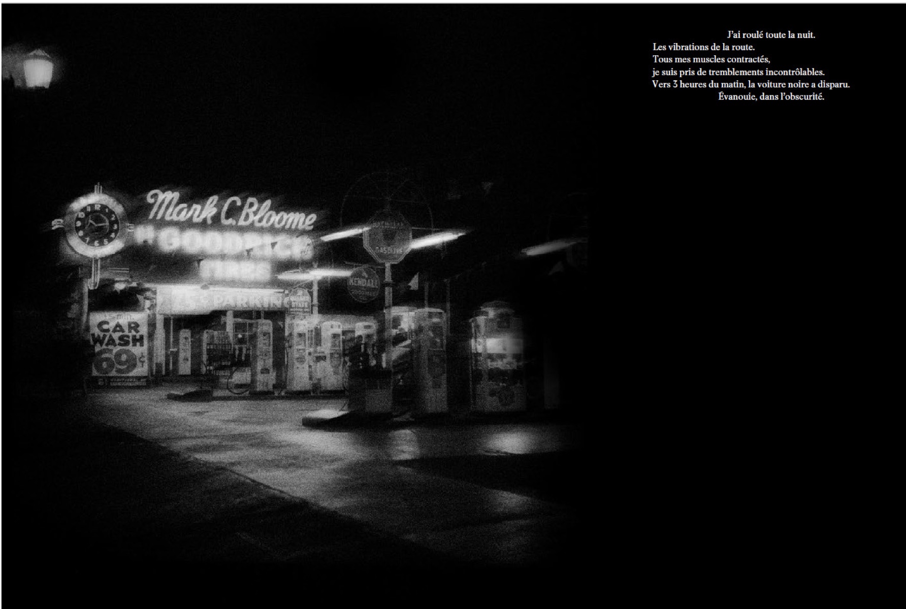 Le livre alterne images et incises textuelles : la voix intérieure du narrateur s’entrelace aux visuels ultra contrastés, entre obscurités profondes et surexpositions. Le rythme graphique, scandé par des effets de boucle et des ruptures visuelles, plonge le lecteur dans une atmosphère proche de la Beat Generation et du roman noir.