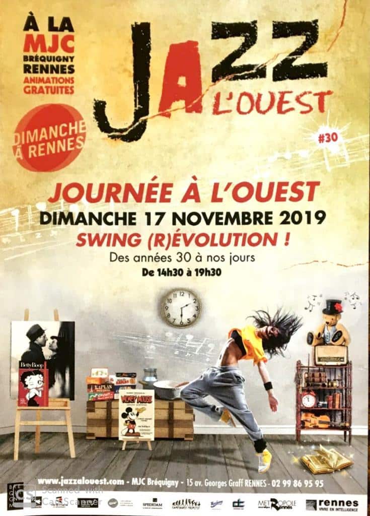 Cette année, le festival Jazz à l’Ouest qui se déroule du 6 au 23 novembre 2019 à Rennes fête ses 30 ans ! Afin de célébrer cet anniversaire, la MJC Bréquigny, l’organisatrice de cet évènement, vous propose une journée rétrospective autour des grands tournants culturels qui ont marqué l’Histoire des années 30 à nos jours. Intitulé Journée à l’Ouest, ce temps fort du festival se déroulera le dimanche 17 novembre 2019 à partir de 14h30 à la MJC Bréquigny. Il sera l’occasion de laisser libre cours à votre esprit, autrement dit, “d’être à l’ouest” au travers de nombreuses activités et animations gratuites et ouvertes à tous sur le thème “Swing (R)évolution !”.