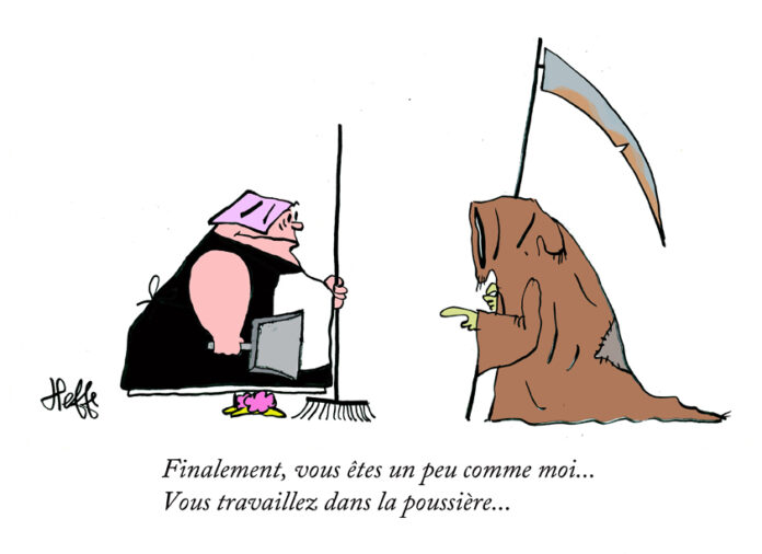 Eh bien non, rien de tout ça. Devant Madame Georges, dans l’encadrement de la porte, se tient une petite chose habillée dans une espèce de sac à pommes de terre rapiécé. Une capuche et un trou noir à la place de la tête. A la main un grand truc rouillé, genre faux de l’ancien temps. « Je suis la mort » dit-elle. Elle n’a vraiment pas l’air de rigoler, la p’tite mère. Mais Madame Georges n’est pas fille à s’en laisser compter. Pensez donc : vingt ans crêpière à Sainte Anne la Palud, un taux de cholestérol de cétacé et une sexualité sans répit. Après Eros, Thanatos donc.