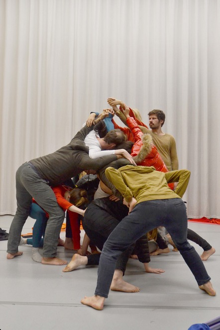 Bien qu’ayant un parcours important avec la danse ( j’ai fait beaucoup de scénographie pour Loïc Touzé et Emmanuelle Huynh) ma profession n’est pas chorégraphe et il m’a fallu éviter leur schéma. Lors du premier jour de rencontre avec les danseurs, la toute première chose a été de s’échauffer ensemble2 et ensuite garder un esprit ludique a été très important.