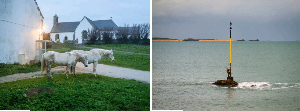 L’exposition fait la lumière sur un monde à part, celui des îliens comme les 250 habitants de l’île d’Houat au large de Quiberon (56) avec sa nature sauvage, et ceux de l’île voisine authentique et pittoresque de Hoëdic qui vivent sur un bout de terre de 2,5 km de long et de 1 km de large, où l’on ne se déplace quasiment qu’à pied. Ces deux îles font face à l’océan, protégées par une succession de falaises ; ce sont des terres de marins sans voitures. Avec l’île aux Moines qui veille en avant-poste sur les terres bretonnes, ces trois petits coins de paradis font le bonheur des 3000 touristes qui viennent l’été se ressourcer loin du continent.